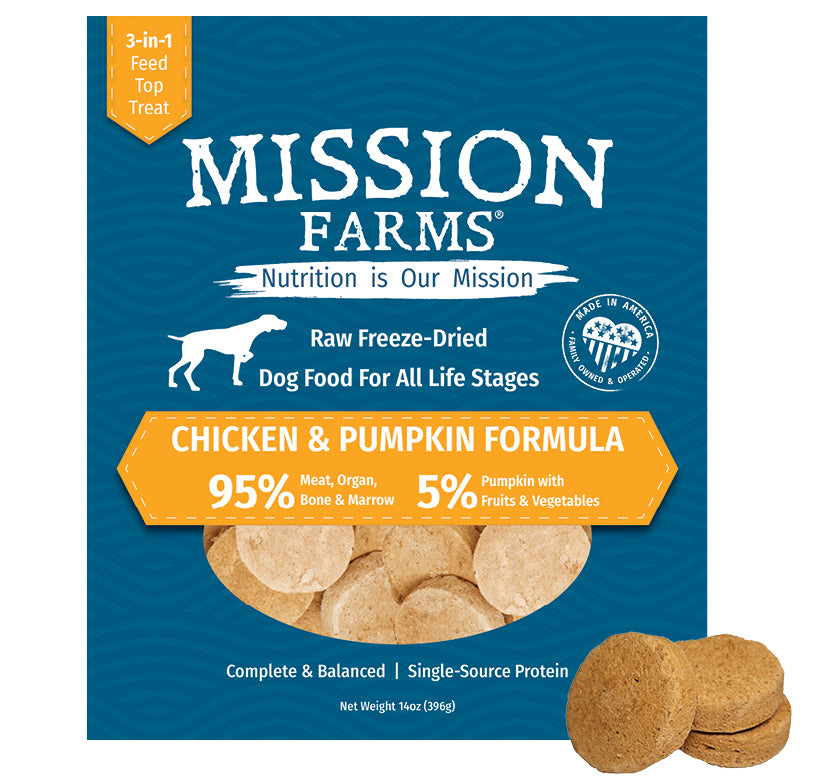 Highest nutritional value. Mission Farms freeze-dried dog food is made with human grade muscle meat, organ meat, bone, marrow and pumpkin.